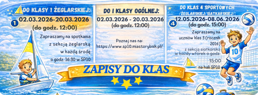 Testy sportowe dla kandydatów do klasy pierwszej szkoły podstawowej o profilu żeglarskim odbędą się 24.03.2026 (wtorek) o godz. 16:00 w sali gimnastycznej SP 10 w Rybniku przy ul. Grunwaldzkiej 18.