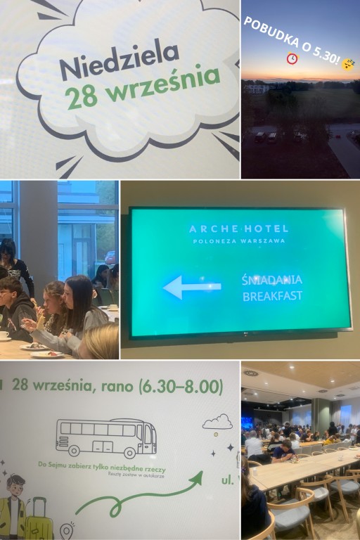 Nasi uczniowie – Karolina Knesz, Hanna Piekorz i Maksymilian Badaczewski – wzięli udział w XXXI sesji Sejmu Dzieci i Młodzieży. Opiekunem grupy była pani Anna Dziendziel. Pobyt w Warszawie trwał od 27 do 28 września 2025 roku. W sobotę uczestnicy intensywnie zwiedzali stolicę. Po krótkim odpoczynku w hotelu Arche Poloneza, wyruszyli wcześnie rano do Sejmu RP, gdzie odbywały się obrady. Gościem specjalnym sesji był astronauta Sławosz Uznański-Wiśniewski – drugi Polak w historii, który poleciał w kosmos. Maksymilianowi udało się nawet zrobić sobie pamiątkowe zdjęcie z panem Uznańskim-Wiśniewskim. Podczas przerw w obradach uczestnicy mieli okazję zwiedzić budynek Sejmu, stanąć na mównicy poselskiej oraz poznać rówieśników z całej Polski.
