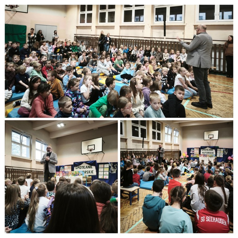 Dziś 17.11.2025 uczniowie klas edukacji wczesnoszkolnej uczestniczyli w wyjątkowym spotkaniu z autorem książek dla dzieci i nie tylko. Podczas spotkania autor Waldemar Cichoń opowiadał o swojej twórczości oraz o powstaniu popularnej serii o kotku Cukierku.