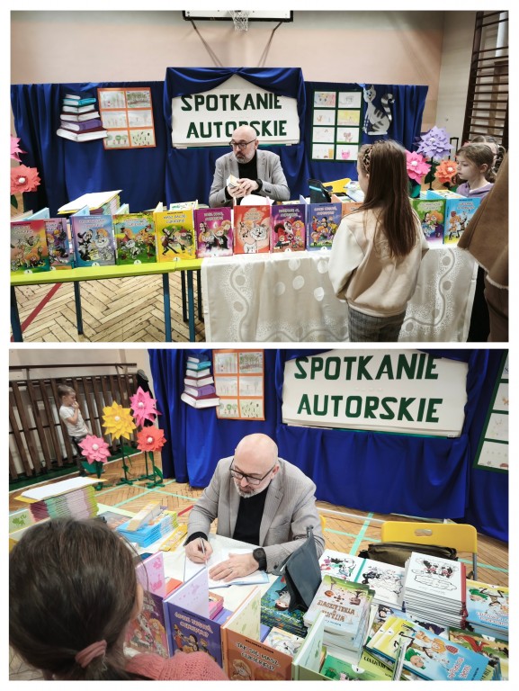 Po inspirujących opowieściach przyszedł czas na serię pytań od naszych młodych czytelników — dzieci z ogromnym zainteresowaniem dopytywały o bohaterów i proces pisania. Na zakończenie autor wpisywał dedykacje do książek dla chętnych uczniów, co było dla nich miłym i wyjątkowym przeżyciem. To było pełne humoru, radości i inspiracji spotkanie, które na długo zostanie w pamięci uczniów. Dzieci wróciły do klas z szerokimi uśmiechami!