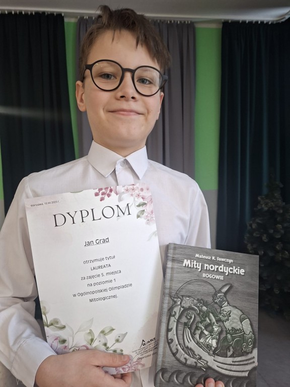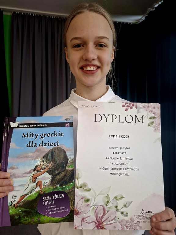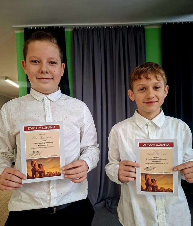 14 listopada 2025r. odbyła się Ogólnopolska Olimpiada Mitologiczna dla szkół podstawowych i średnich W całej Polsce z testem konkursowym zmagało się 1620 uczniów z klas IV -VI .Naszą szkolę reprezentowały cztery niezwykle zdolne osoby- Jan , Lena , Leon i Antoni.