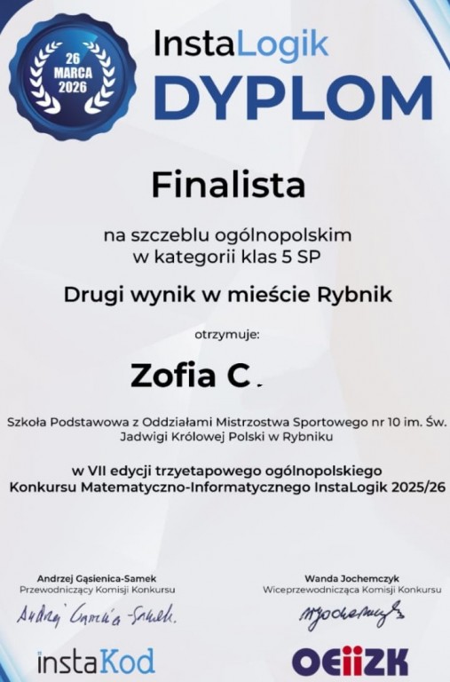 Antoni uzyskał także najlepszy wynik w mieście Rybnik z kategorii klas 6. Słowa uznania należą się także Zofi C. z klasy 5ż, która została finalistką na szczeblu ogólnopolskim z kategorii klas 5. Zofia uzyskała drugi wyniki w mieście Rybnik.