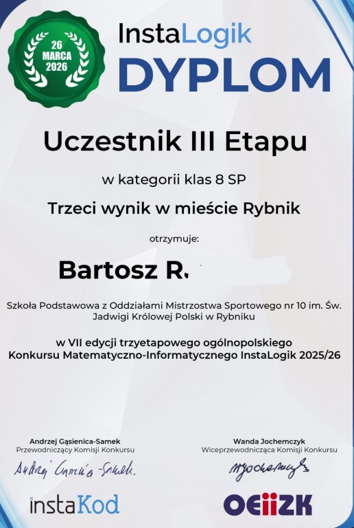 W III etapie konkursu Instalogik startował także Bartosz R. z klasy 8a, który miał trzeci wynik w mieście Rybnik w kategori klas 8. Gratulujemy!