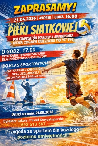 Godz. 16:00 – Zajęcia z piłki siatkowej dla wszystkich kandydatów do klasy 4 sportowej. To idealna okazja, aby sprawdzić się na boisku pod okiem fachowca!